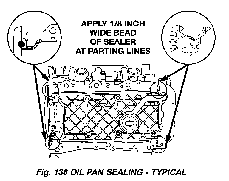 2) Apply a 1/8 inch bead of Mopar Engine RTV GEN II at the parting line of the oil pump housing and the rear seal retainer (Fig. 136).