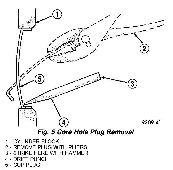 STANDARD PROCEDURE - ENGINE CORE AND OIL GALLERY PLUGSUsing a blunt tool such as a drift and a hammer, strike the bottom edge of the cup plug. With the cup plug rotated, grasp firmly with pliers or other suitable tool and remove plug (Fig. 5).