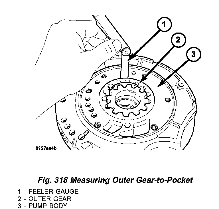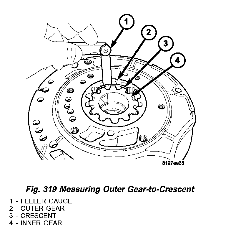6. Measure clearance between outer gear (2) (Fig. 319) and crescent (3). Clearance should be 0.060 - 0.298 mm (0.0023 - 0.0117 inch).