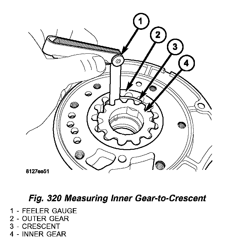 7. Measure clearance between inner gear (4) and crescent (3) (Fig. 320). Clearance should be 0.093 - 0.385 mm (0.0036 - 0.0151 inch).