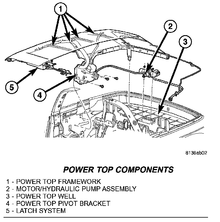 The power top system allows the convertible top to be raised and lowered electrically by actuating a switch in the center floor console. The power top system receives battery feed through a fuse in the Power Distribution Center (PDC), only when the ignition switch is in the ON position.The operation of the power top is controlled by the Body Control Module (BCM). The BCM also controls the "top down/4 window down feature when the power top switch is pressed to the second detent position.