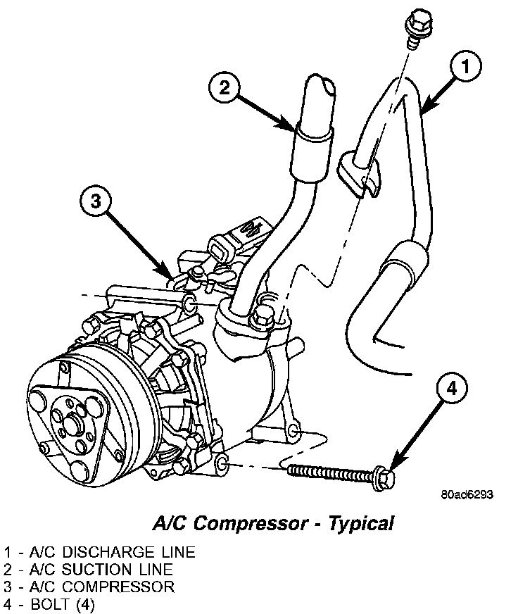 NOTE: The A/C compressor may be removed and repositioned without disconnecting the refrigerant lines or discharging the refrigerant system. Discharging is not necessary if servicing the A/C clutch, clutch field coil or engine.