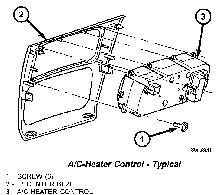 3. Place the center bezel on a workbench and remove the six screws that secure the A/C-heater control to the center bezel.