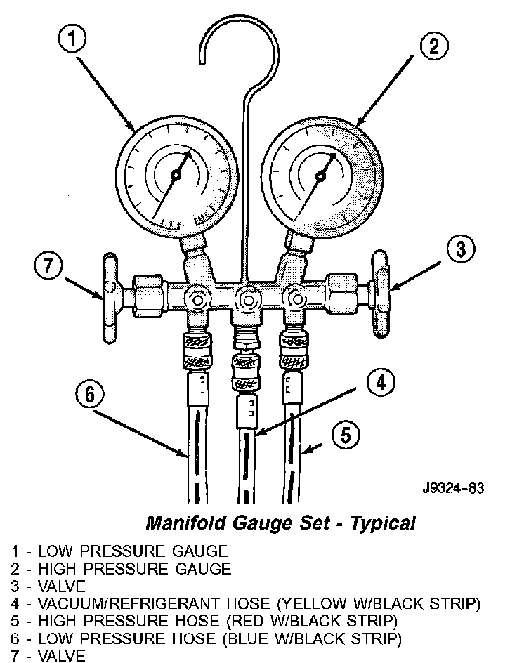 A manifold gauge set may be needed with some recovery/recycling/charging equipment. The manifold gauge set should have manual shut-off valves, or automatic back-flow valves located at the service port connector end of the manifold gauge set hoses. This will prevent refrigerant from being released into the atmosphere.