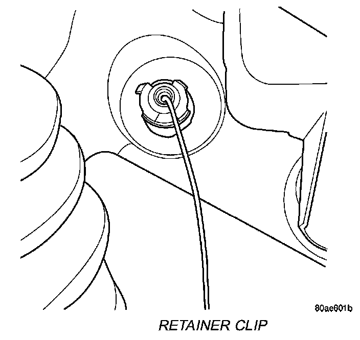 5. At the dash panel, install the cable retainer clip between the end of the throttle cable dash fitting and grommet.