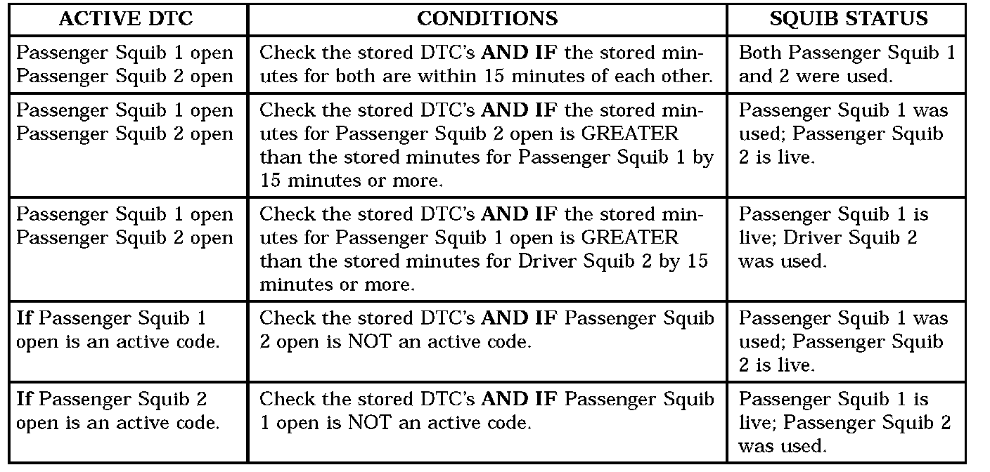CAUTION: Deployed front airbags may or may not have live pyrotechnic material within the airbag inflator. Do not dispose of driver and passenger airbags unless you are sure of complete deployment. Please refer to the hazardous substance control system for proper disposal. Dispose of deployed airbags in a manner consistent with state, provincial, local, and federal regulations. Use the following table to identify the status of the airbag squib.