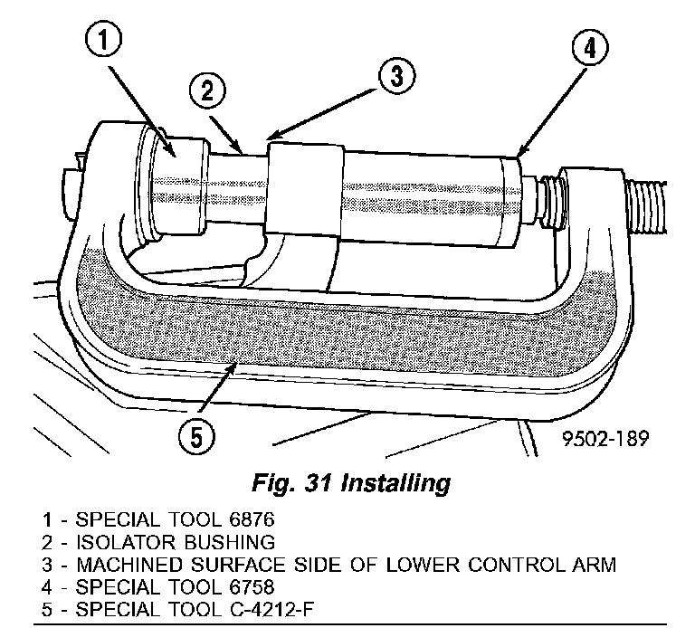 (3) Install lower control arm on Special Tools assembled for installation of front isolator bushing into lower control arm (Fig. 31). Be sure Special Tool 6758 is square on lower control arm and Special Tool 6876 is positioned correctly on isolator bushing.
