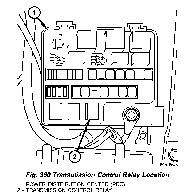 The transmission control relay (2) (Fig. 360) is located in the Power Distribution Center (PDC) (1), which is located on the left side of the engine compartment.