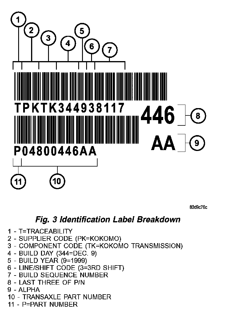 The label contains a series of digits that can be translated into useful information such as transaxle part number, date of manufacture, manufacturing origin, plant shift number, build sequence number, etc. Refer to (Fig. 3) for identification label breakdown.
