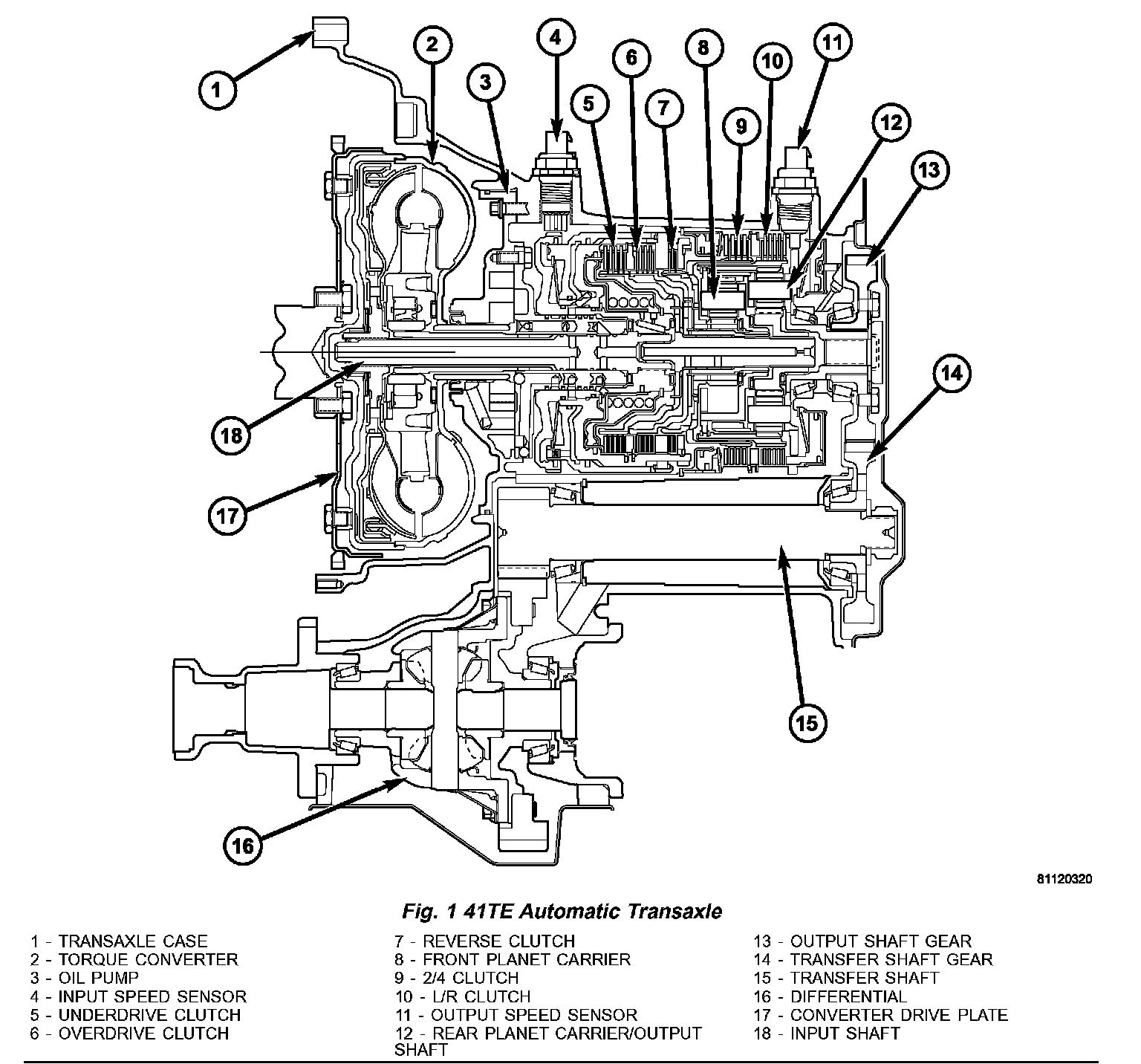 The 41TE (Fig. 1) is a four-speed transaxle that is a conventional hydraulic/mechanical assembly with an integral differential, and is controlled with adaptive electronic controls and monitors. The hydraulic system of the transaxle consists of the transaxle fluid, fluid passages, hydraulic valves, and various line pressure control components. An input clutch assembly which houses the underdrive, overdrive, and reverse clutches is used. It also utilizes separate holding clutches: 2nd/4th gear and Low/Reverse. The primary mechanical components of the transaxle consist of the following: