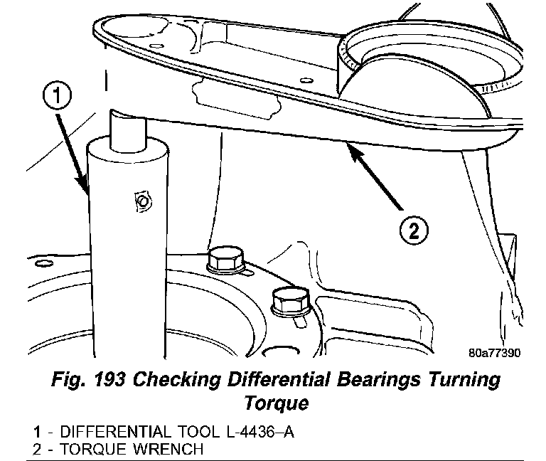 (4) Using Differential Tool L-4436A (1) (Fig. 193) and an inch-pound torque wrench (2), check the turning torque of the differential. The turning torque should be between 5 and 18 inch lbs.