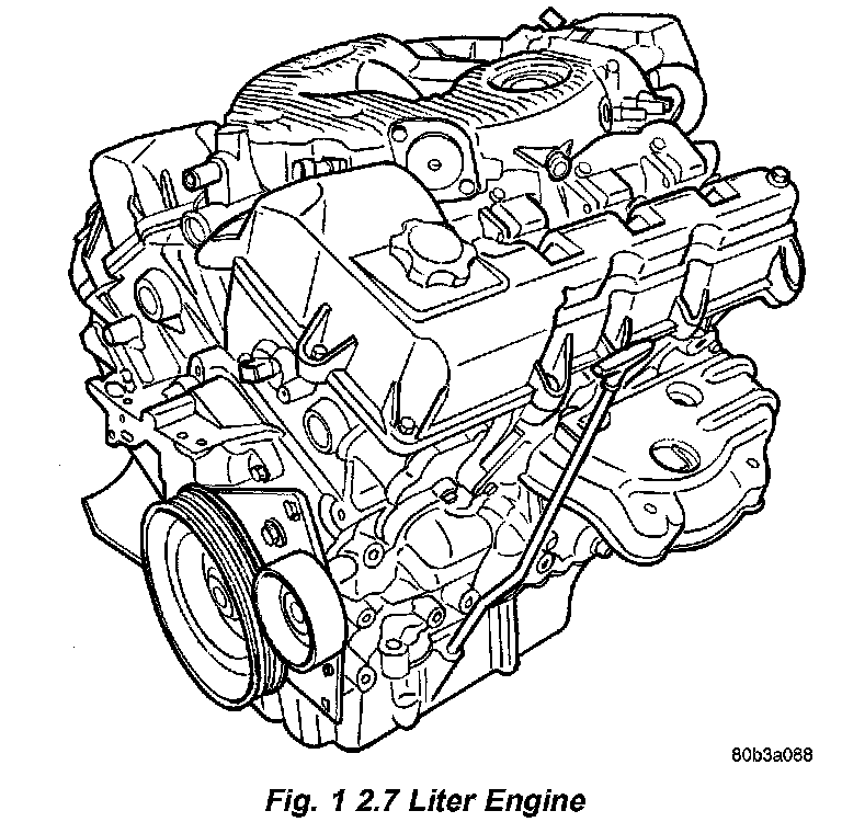 The 2.7 Liter (167 Cubic Inches) 60 degree V-6 engine is a double overhead camshaft design with hydraulic lifters and four valves per cylinder (Fig. 1). The engine does not have provisions for a free wheeling valve train.
