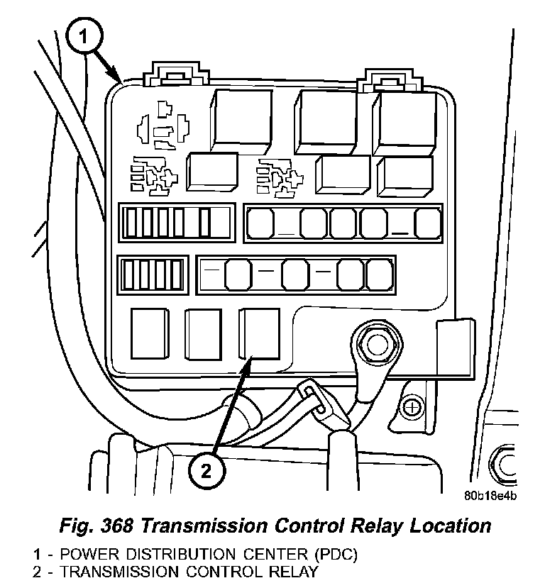 The transmission control relay (2) (Fig. 368) is located in the Power Distribution Center (PDC) (1), which is located on the left side of the engine compartment.