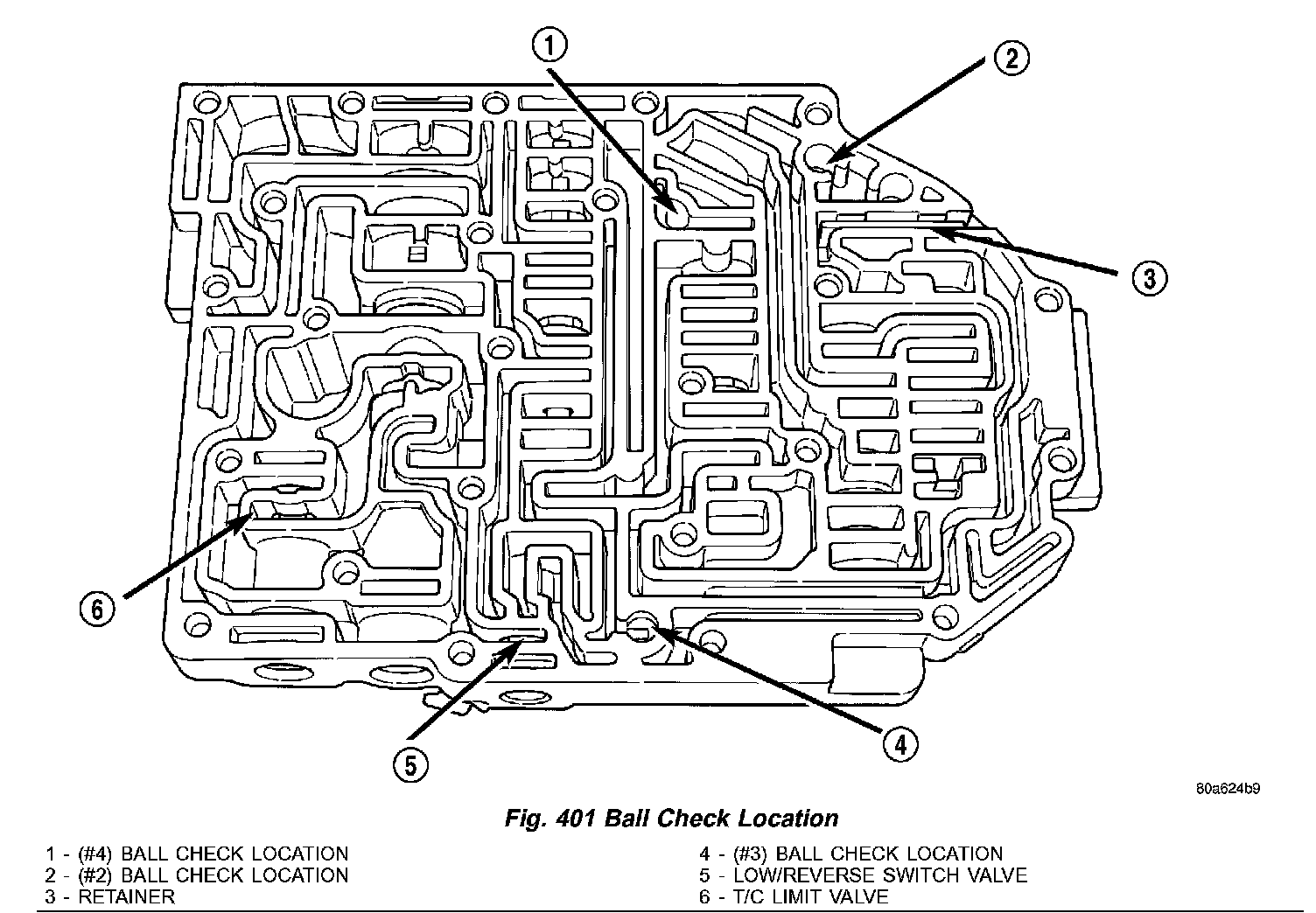 (5) Install check balls into position (1,2 and 4) (Fig. 401). If necessary, secure them with petrolatum or transmission assembly gel for assembly ease.