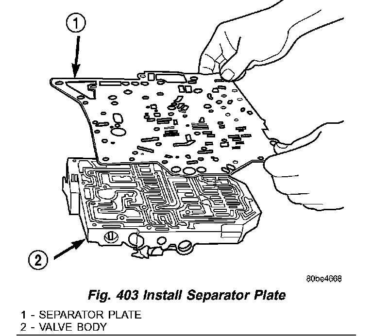 (7) Install separator plate (1) (Fig. 403) to valve body (2).