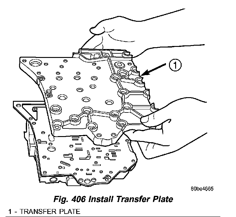 (10) Install transfer plate (1) (Fig. 406) to valve body and separator plate. Make sure oil screen and #5 check valve do not bind.