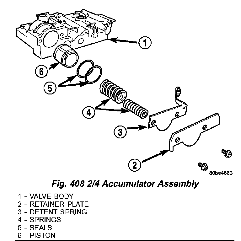 (12) Install 2/4 Accumulator components (2,3,4,5 and 6) (Fig. 408).