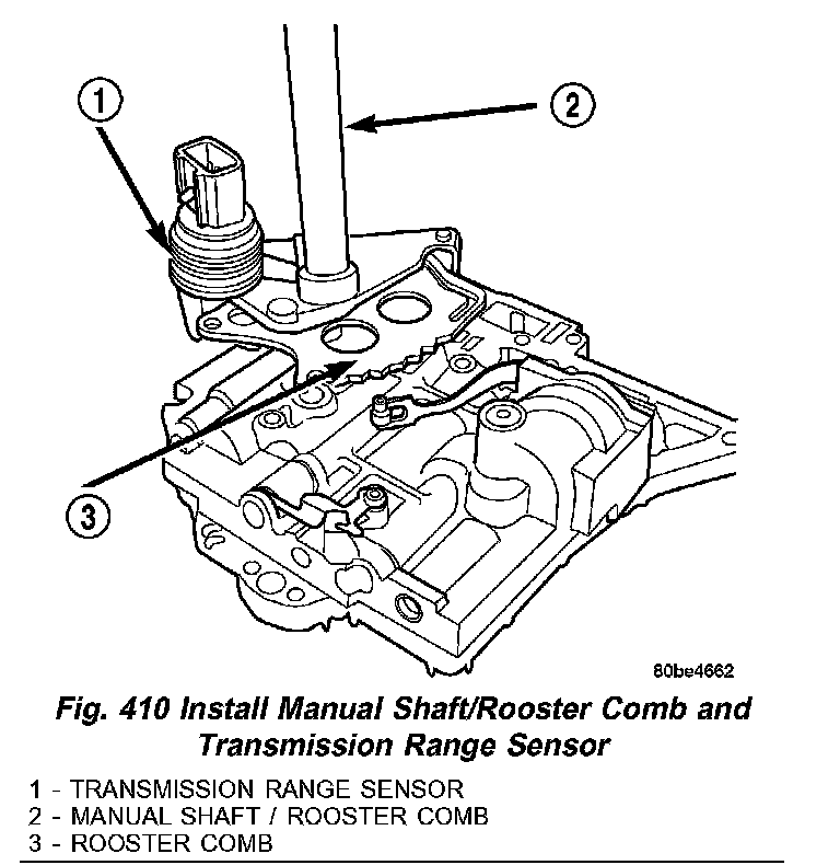 (14) Install Manual Shaft/Rooster Comb (3) (Fig. 410) and Transmission Range Sensor (1).