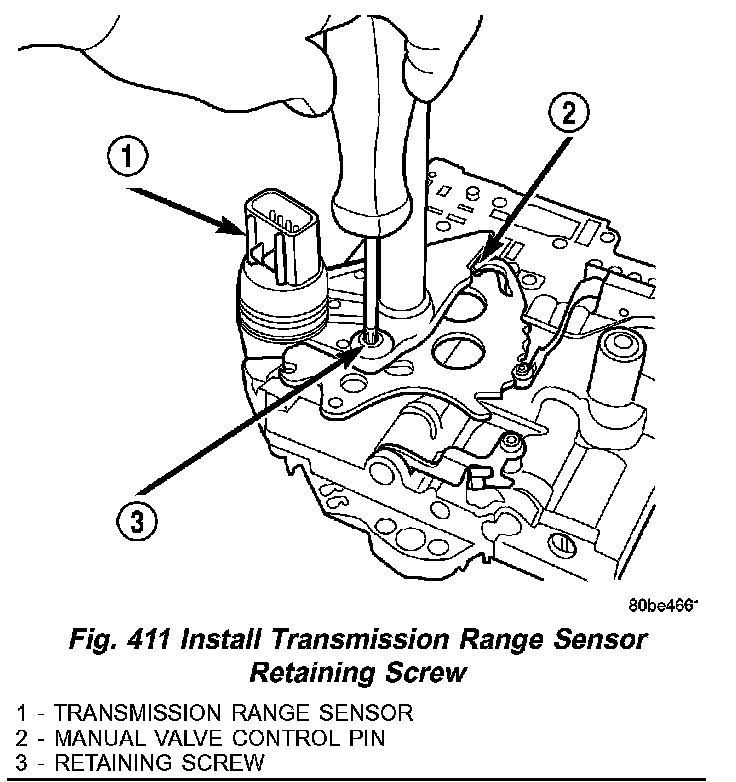 (15) Make sure Manual Valve control pin (2) (Fig. 411) is contained within the rooster comb slot. Install Transmission Range Sensor retaining screw (3) and torque to 5 Nm (45 inch lbs.).