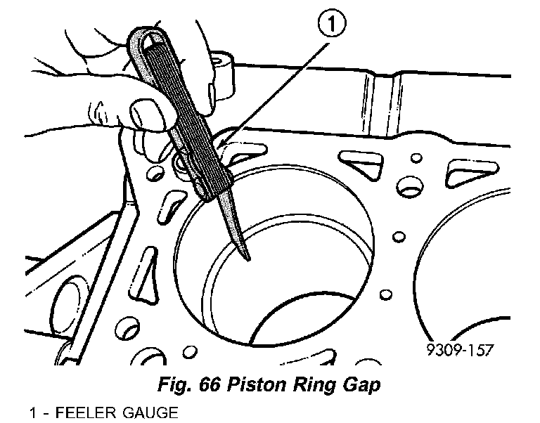 1. Wipe cylinder bore clean. Insert ring and push down with piston to ensure it is square in bore. The ring gap measurement must be made with the ring positioning at least 12 mm (0.50 inch) from bottom of cylinder bore. Check gap with feeler gauge (Fig. 66).