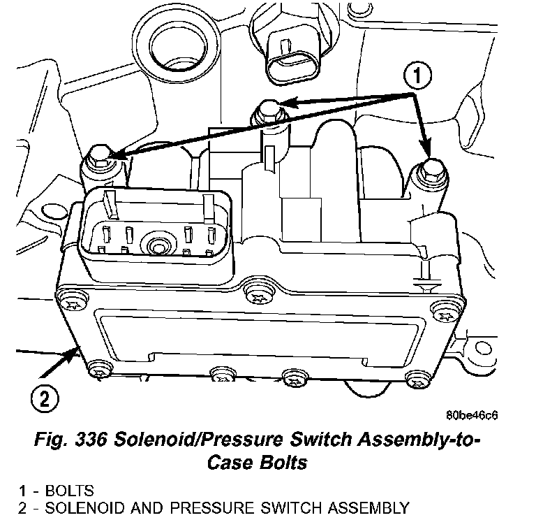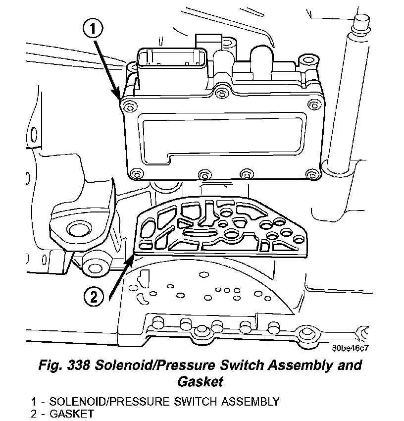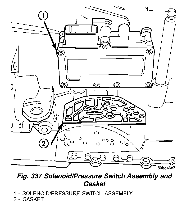 (7) Remove solenoid/pressure switch assembly (1) (Fig. 337) and gasket (2). Use care to prevent gasket material and foreign objects from become lodged in the transaxle case ports.