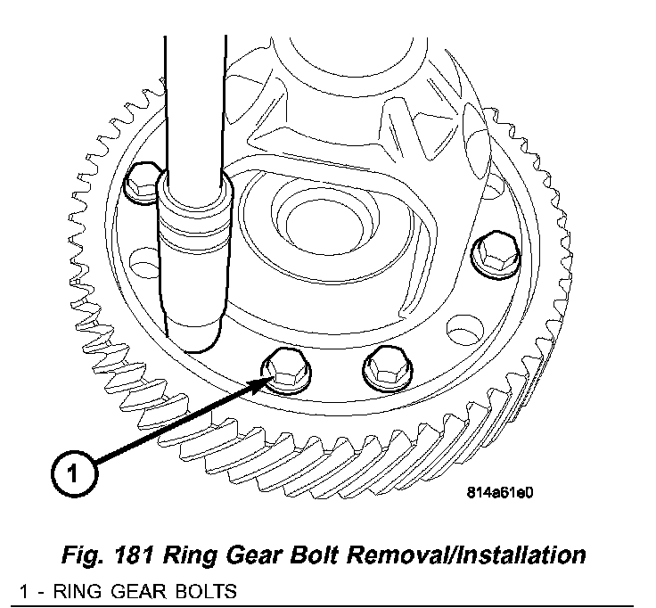 (1) Position differential case to ring gear. Install ring gear-to-differential case bolts (1) (Fig. 181) and draw ring gear into position. Torque bolts to 95 Nm (70 ft. lbs.).