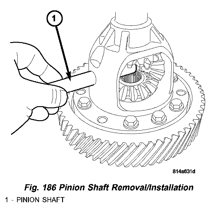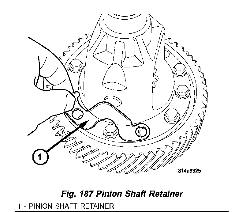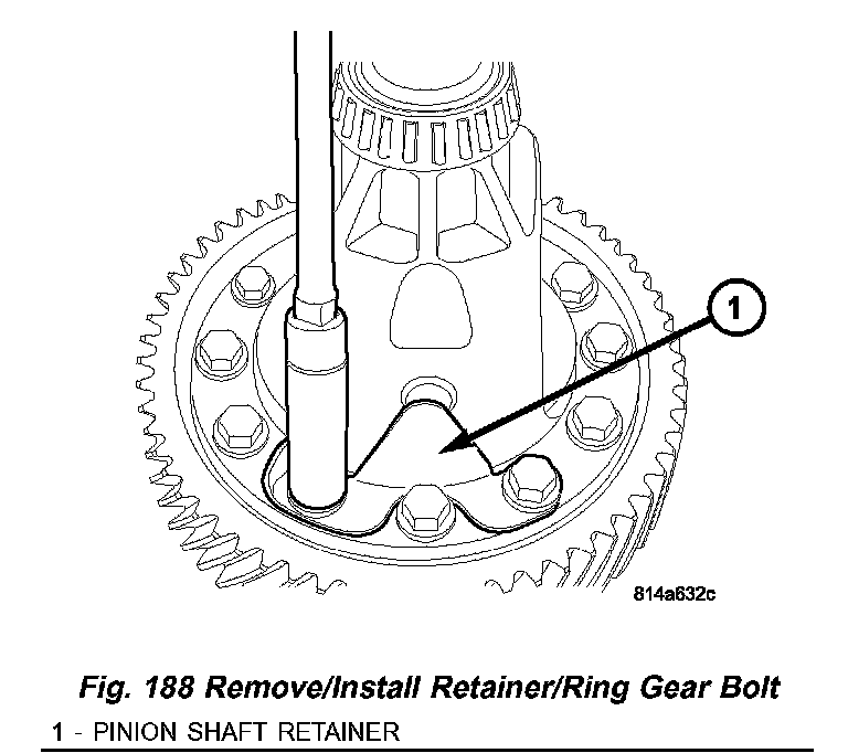 (8) Install pinion shaft retainer/ring (1) (Fig. 188) gear-to-differential case bolts and torque to 95 Nm (70 ft. lbs.).