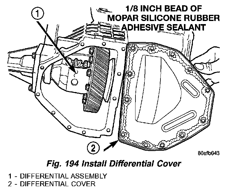 (18) Install differential cover (2) (Fig. 194) with a bead of Mopar Silicone Rubber Adhesive Sealant and torque bolts to 28 Nm (250 inch lbs.).