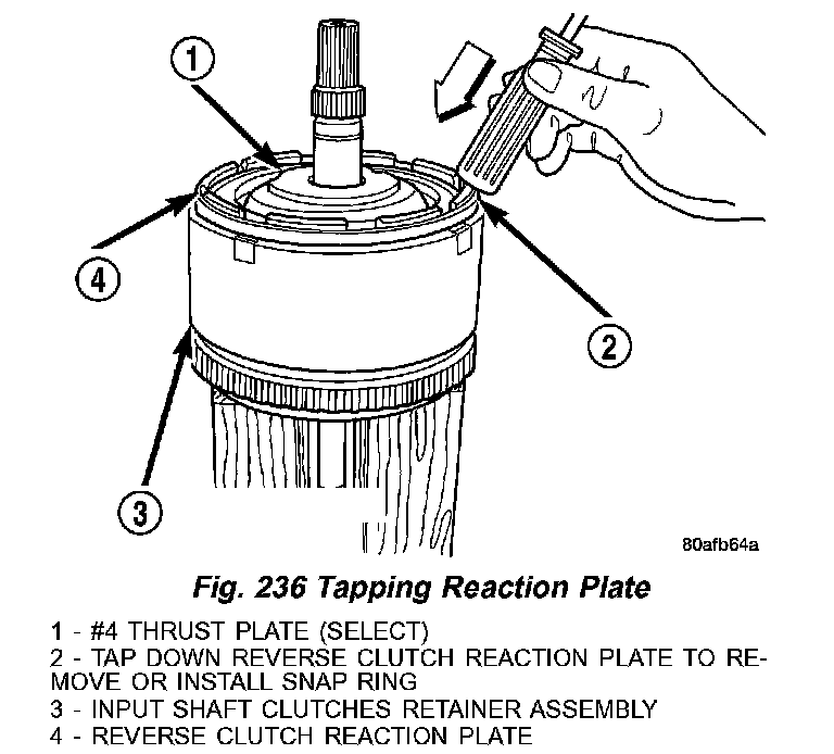 (2) Tap down reverse clutch reaction plate to release pressure from snap ring (2) (Fig. 236).