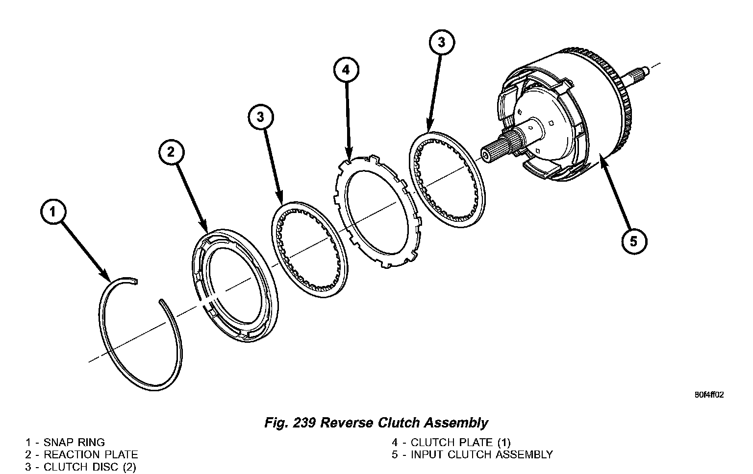 (5) Remove reverse clutch pack (1,2,3 and 4) (Fig. 239). Tag components for assembly identification.