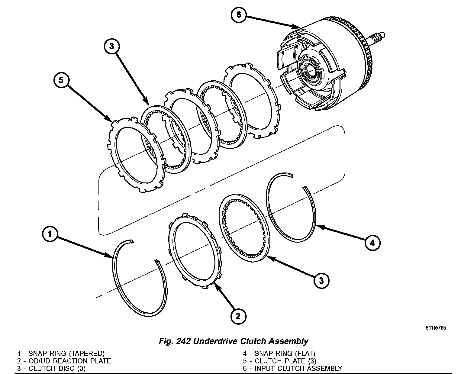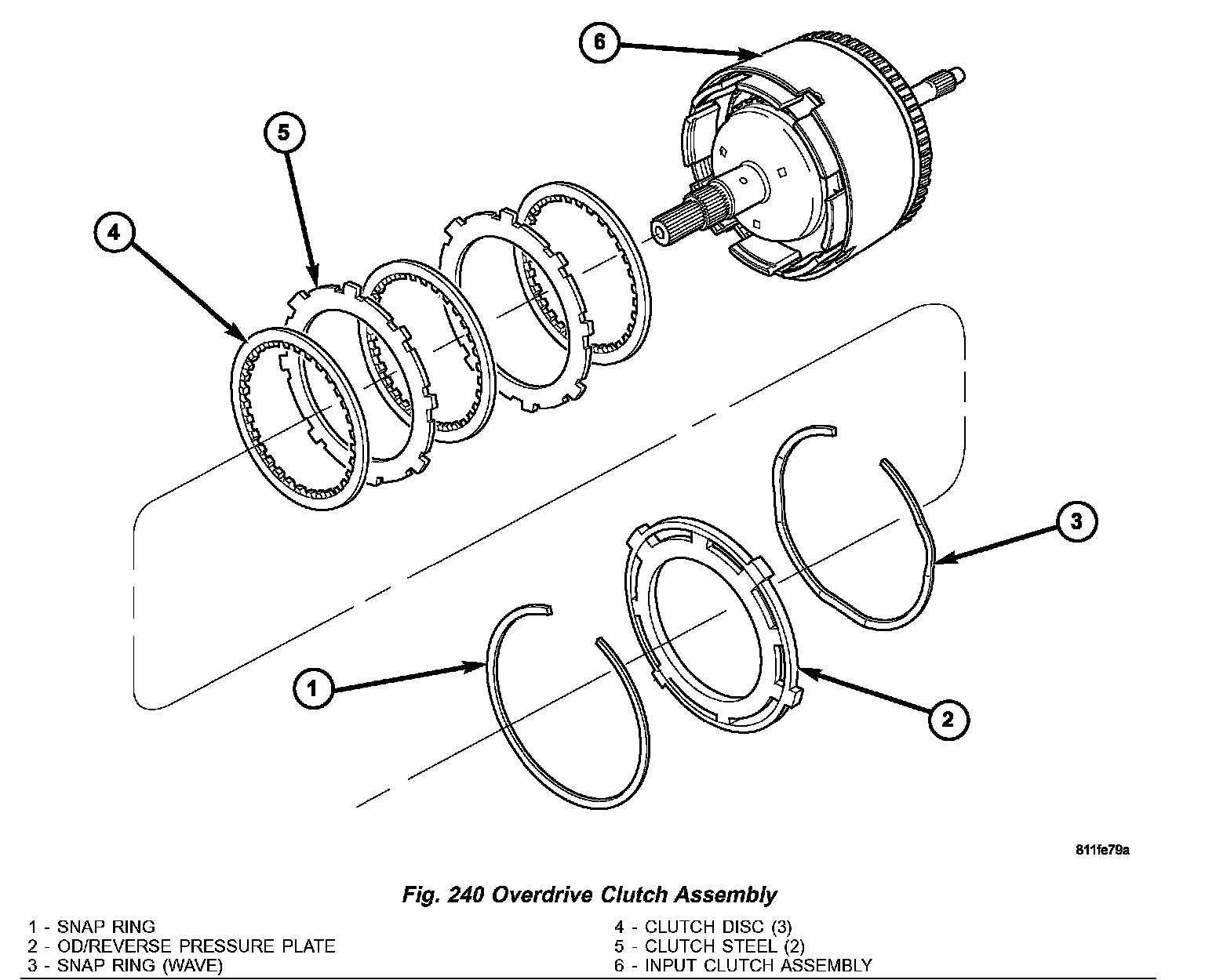 (6) Remove the OD/Reverse pressure plate snap ring (1) (Fig. 240).