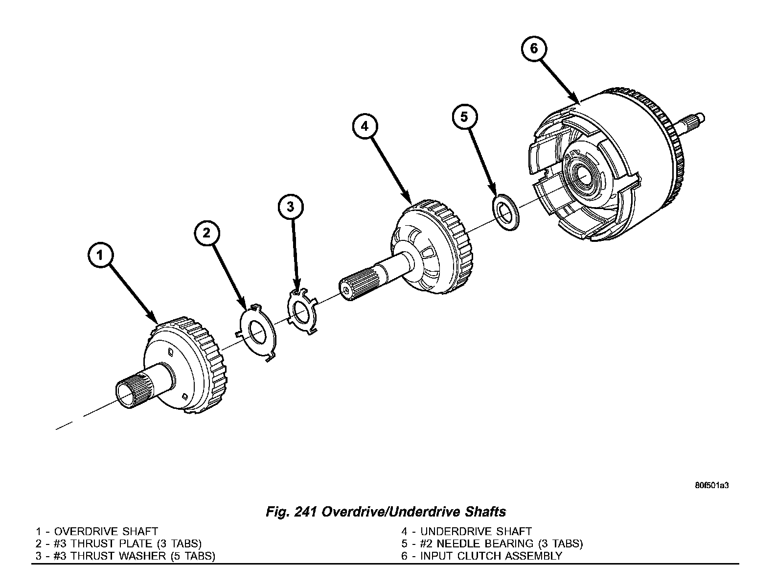 (10) Remove and inspect OD (1) (Fig. 241) and UD (4) Shafts, as well as #3 thrust washer (3) and plate (2), and #2 needle bearing (5).
