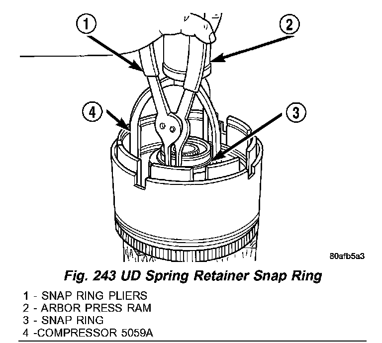 (13) Using Compressor 5059A (4) and an arbor press (2), compress UD clutch piston/spring enough to remove snap ring (3).