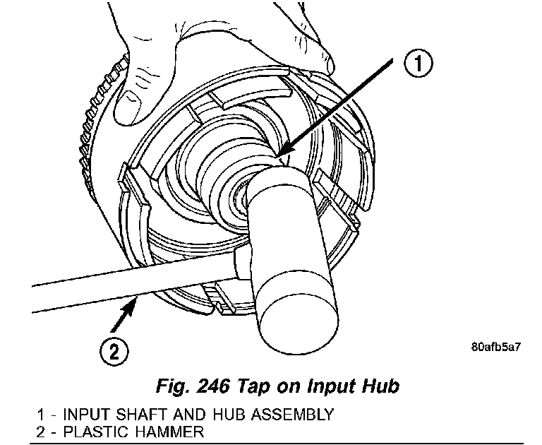 (16) Tap on input hub (1) (Fig. 246) with soft faced hammer (2) and separate input hub from OD/Reverse piston and clutch retainer.