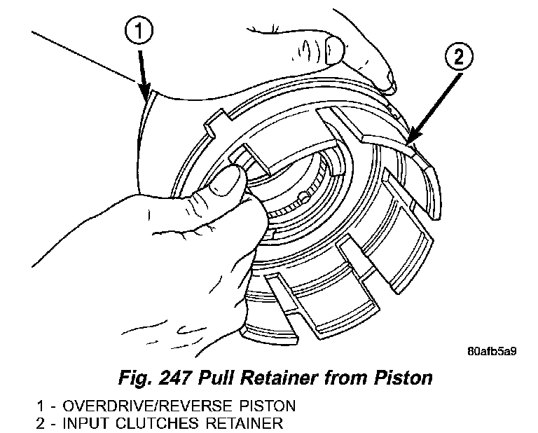 (17) Separate clutch retainer (2) (Fig. 247) from OD/Reverse piston (1).
