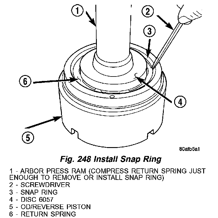 (18) Using Disc 6057 (4) (Fig. 248) and an arbor press, compress return OD/Reverse piston return spring just enough to remove snap ring (3).