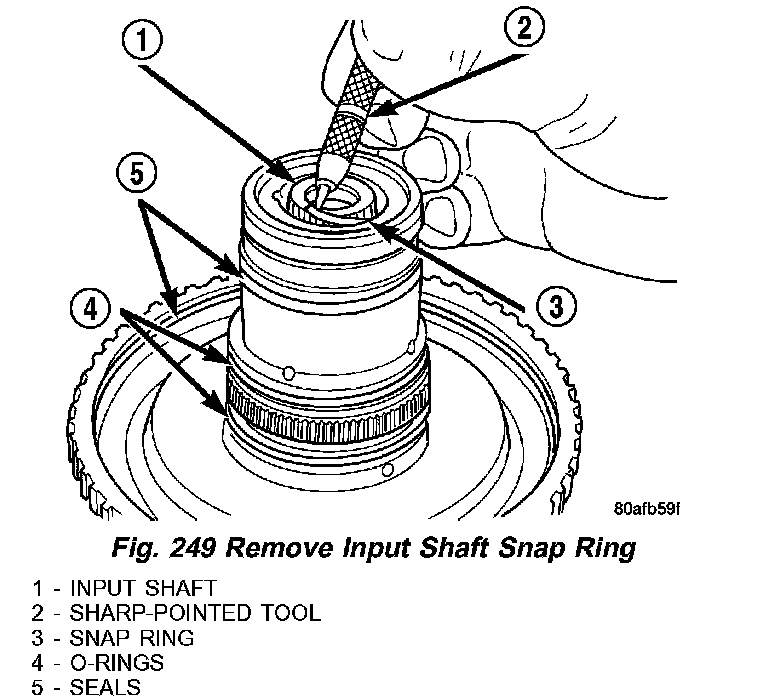 (19) Remove input shaft to input clutch hub snap ring (3) (Fig. 249).
