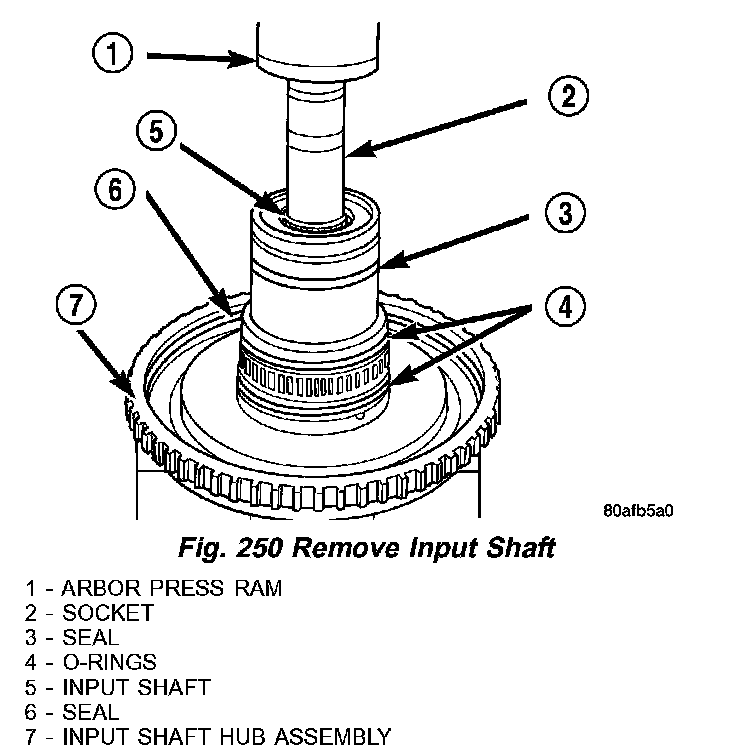 (20) Using a suitably sized socket (2) (Fig. 250) and an arbor press (1), remove input shaft from input shaft hub (7).