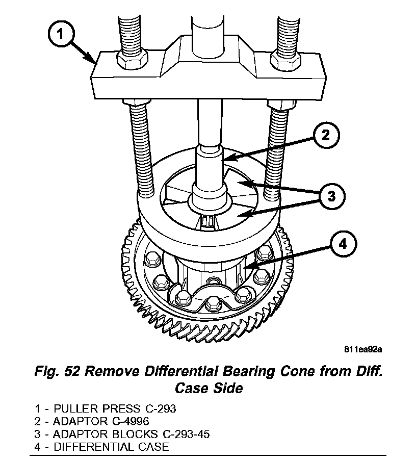 (1) Remove differential bearing cones (ring gear and differential case side) using Puller Press C-293(l) (Fig. 52), Adapter Blocks C-293-45 (3), and Adapter 4996 (2).