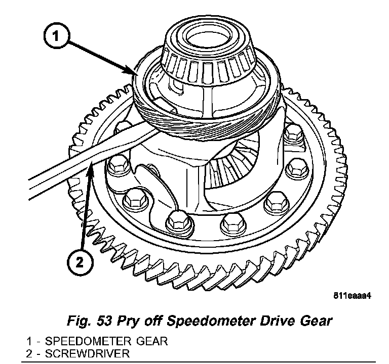 (2) Using a suitable screwdriver (2) (Fig. 53), pry off and remove speedometer drive gear (1).