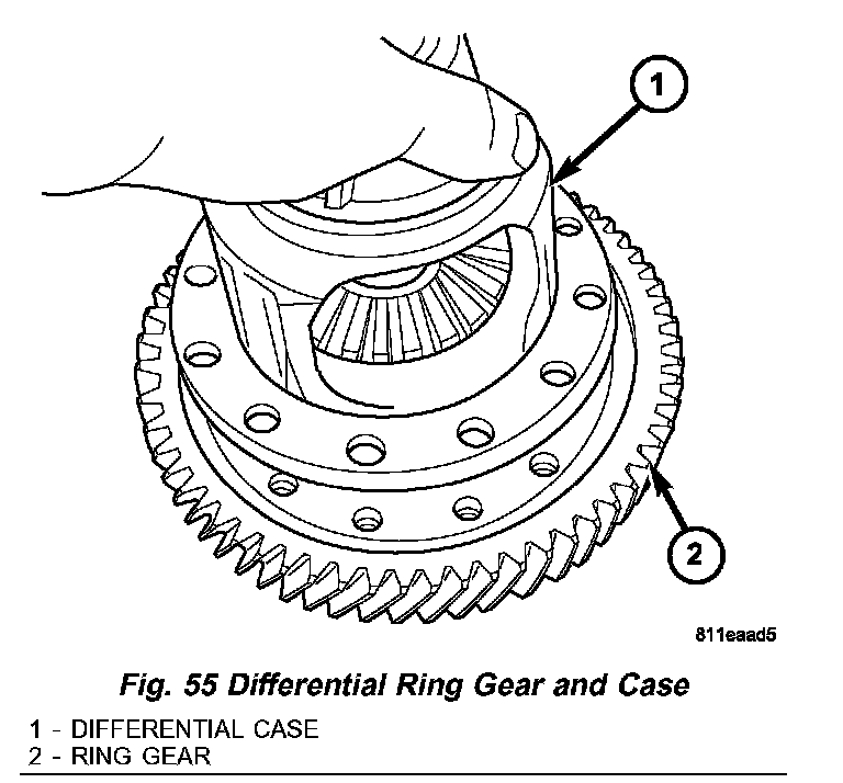 (4) If servicing ring gear (2) (Fig. 55) as well, remove remaining ring gear-to-case bolts and remove ring gear (2) from case (1).