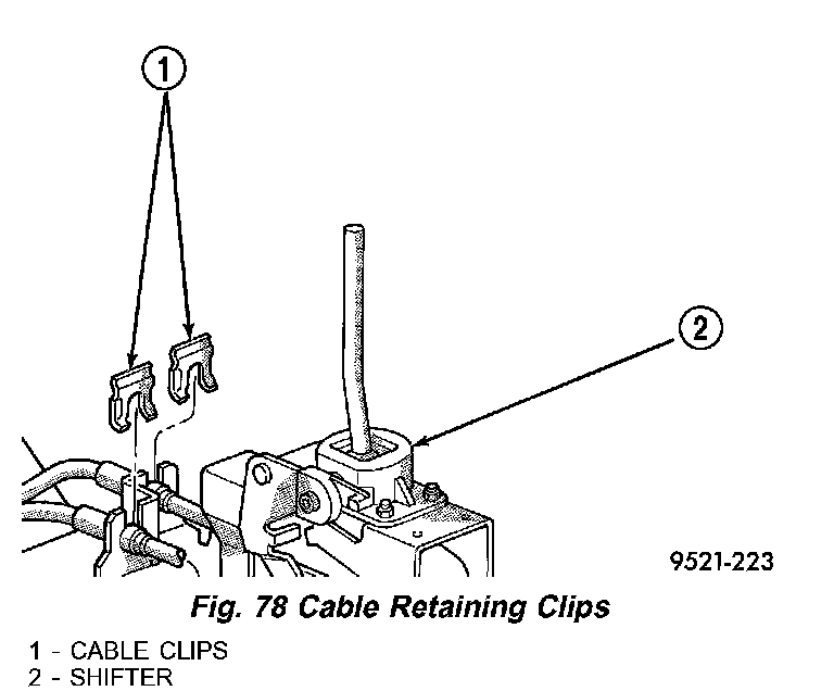 (5) Remove crossover and selector cable retaining clips (Fig. 78) from shift mechanism and disconnect cables.