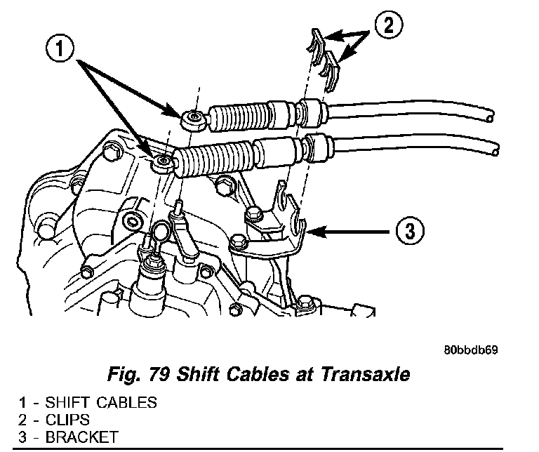 (4) Install gearshift cables to mounting bracket (Fig. 79). Secure with new clips.