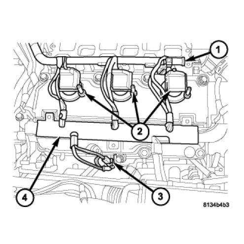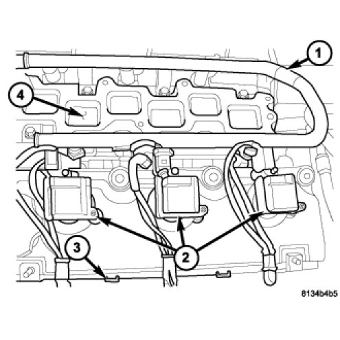 8. Properly position the left engine harness (3) and connect the ignition coil (2) and fuel injector harness connectors.