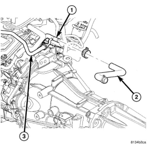 11. Connect the heater hose (2) and coolant reservoir hose (3) to the rear coolant pipe (1).