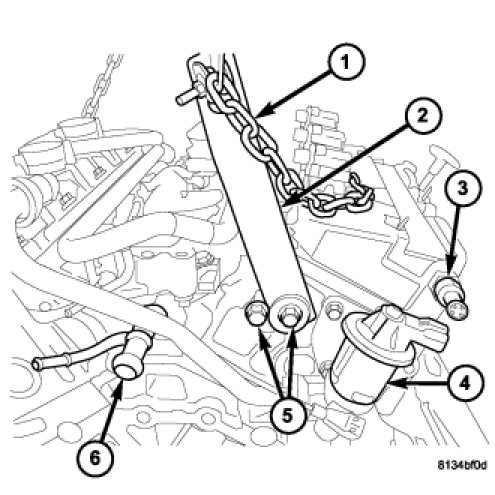 1. Install special tool #8534 B, engine lifting bracket (2) to the right rear of the cylinder head and install a bolt into the inner most bolt hole (5) next to the bracket (5).