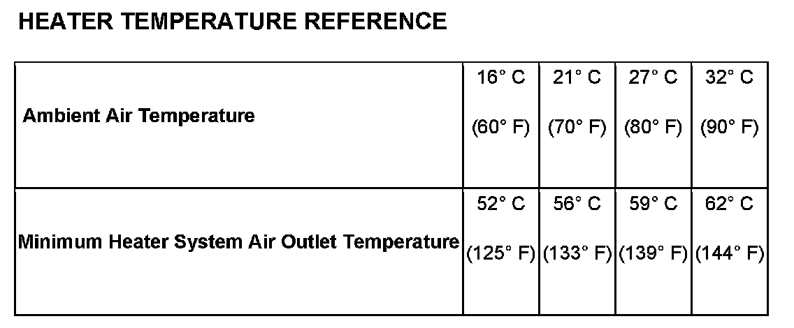 Engine coolant is delivered to the heater core through two heater hoses. With the engine idling at normal operating temperature, set the temperature control to the full hot position, the mode control to the floor position, and the blower motor control to the highest speed position. Using a test thermometer, check the temperature of the air being discharged at the front floor outlets. Compare the test thermometer reading to the Heater Temperature Reference chart.