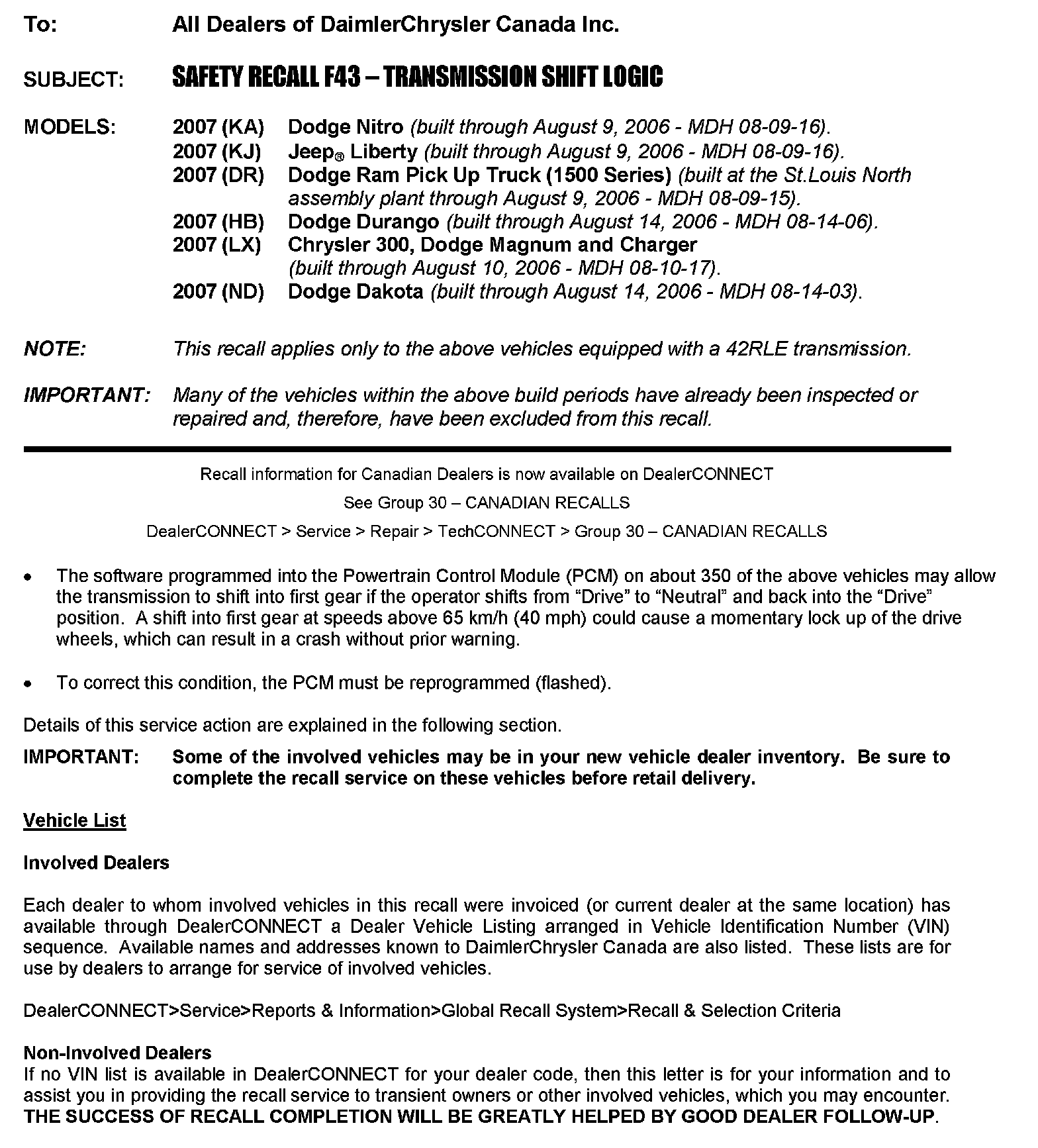 SAFETY RECALL F43 - TRANSMISSION SHIFT LOGIC
