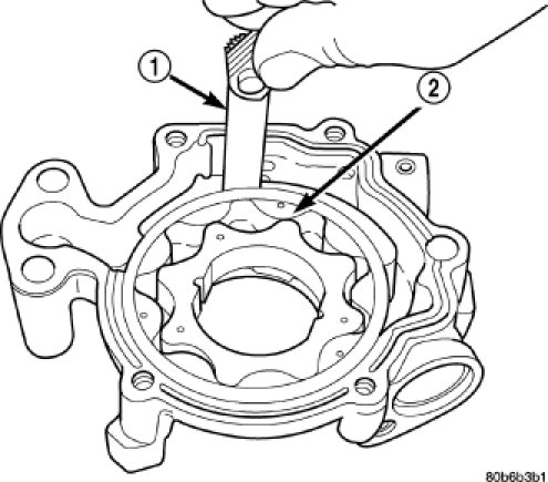 3. Slide outer rotor into the body of the oil pump. Press the outer rotor to one side of the oil pump body and measure clearance between the outer rotor (2) and the body. If the measurement is 0.235mm (0.009 in.) or more the oil pump assembly must be replaced.