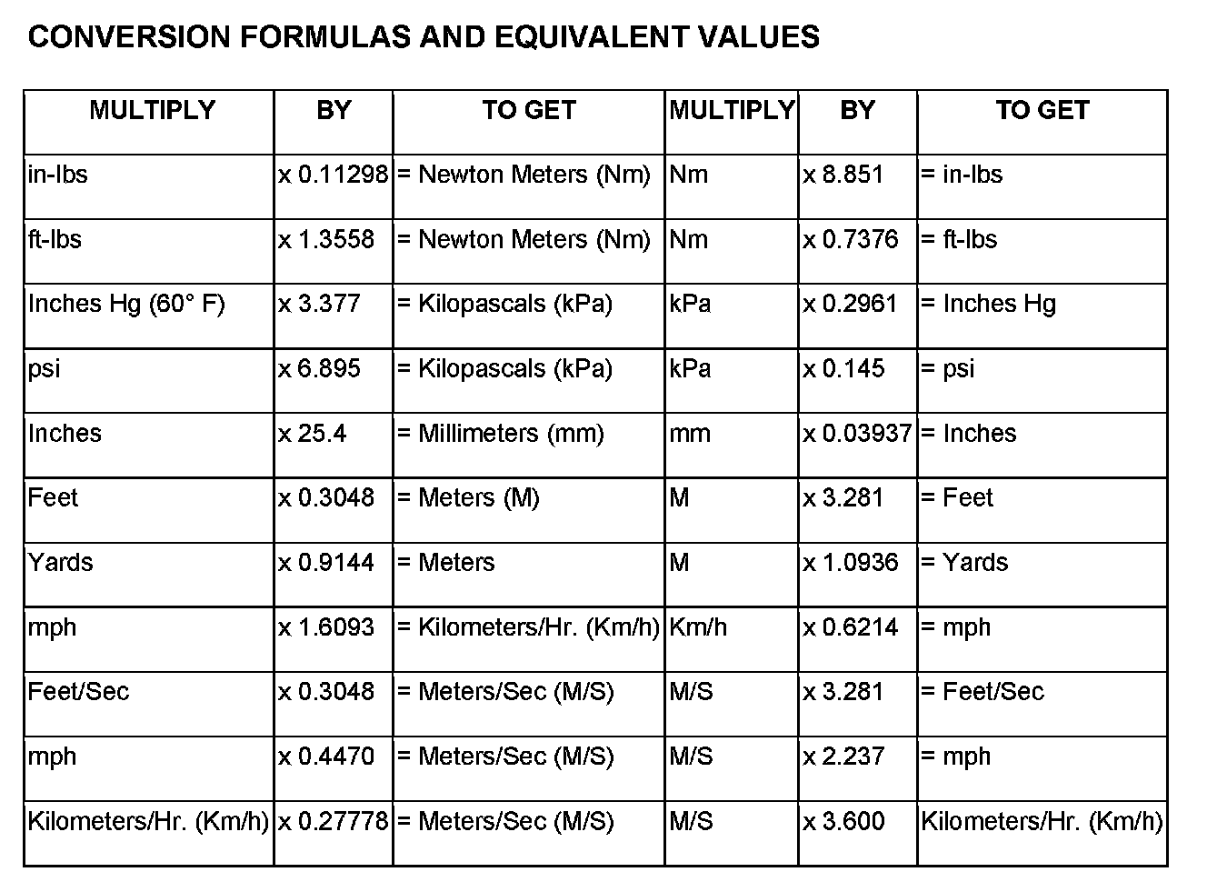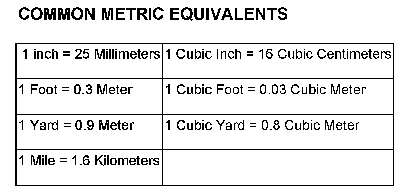 The following chart will assist in converting metric units to equivalent English and SAE units, or vise versa.